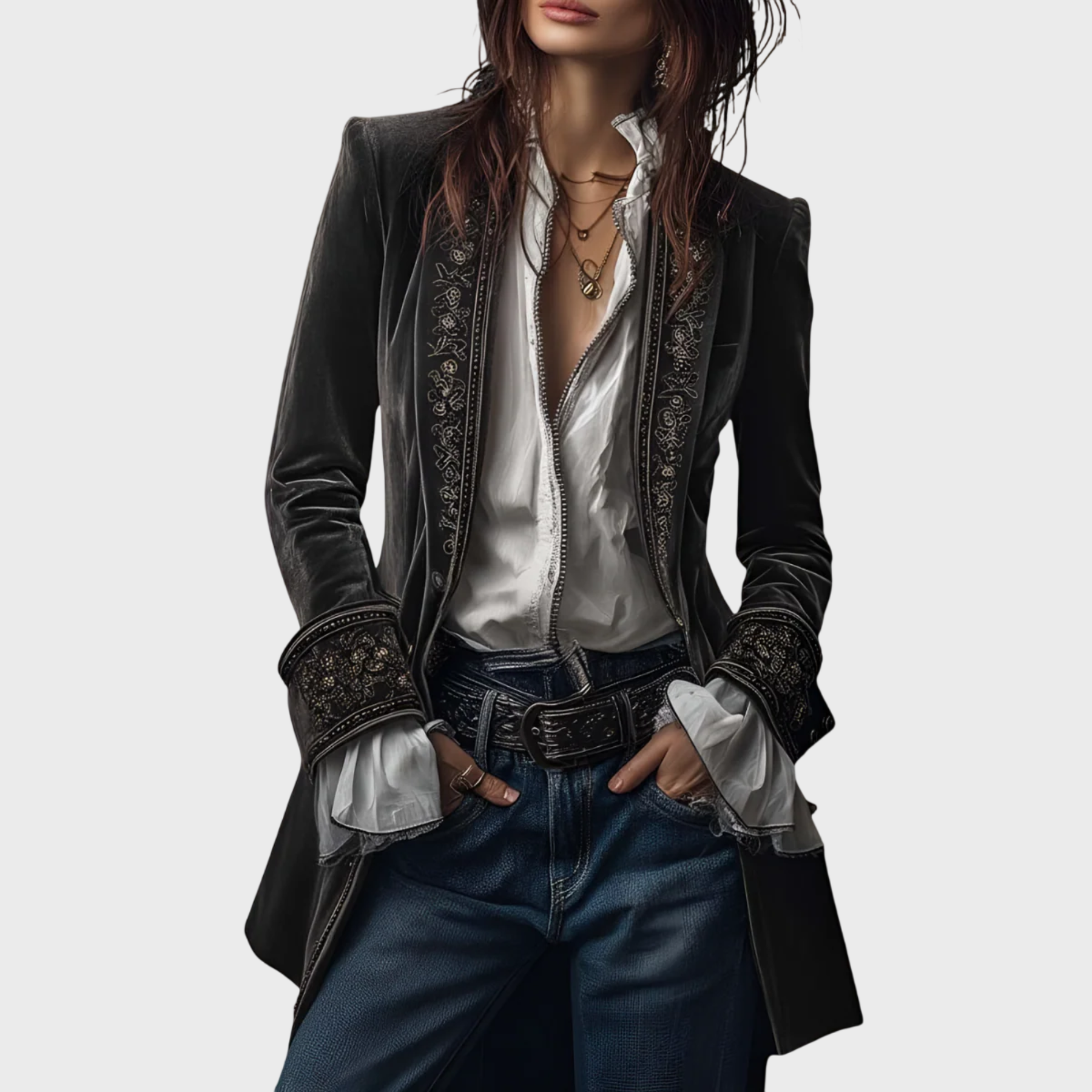 Sacoul Delia | Elegant din catifea este mai mult decât un articol de îmbrăcăminte; el întruchipează stil, confort și încredere în sine. Cu materialul său luxos din catifea și finisajul său excepțional, nu doar că vă oferă o senzație plăcută la purtare, dar vă face să străluciți în orice situație. Răsfățați-vă cu sentimentul de a vă simți bine în pielea dumneavoastră și, în același timp, de a arăta elegant.