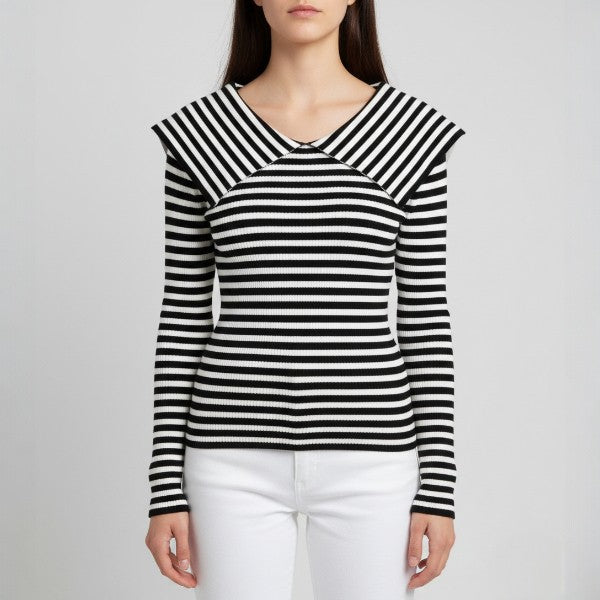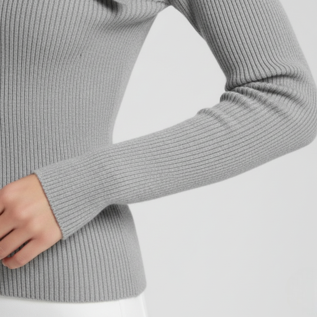 Redefinește-ți garderoba cu acest pulover sofisticat, care combină liniile arhitecturale cu confortul tricotajelor de calitate. Gulerul amplu, drapat în V, încadrează chipul delicat și adaugă un aer rafinat, în timp ce textura striată a materialului subțiază optic silueta, oferindu-ți un look elegant și armonios. Conceput pentru a te face să te simți încrezătoare și confortabilă pe tot parcursul zilei, acest pulover este alegerea ideală pentru femeia care apreciază eleganța modernă.
